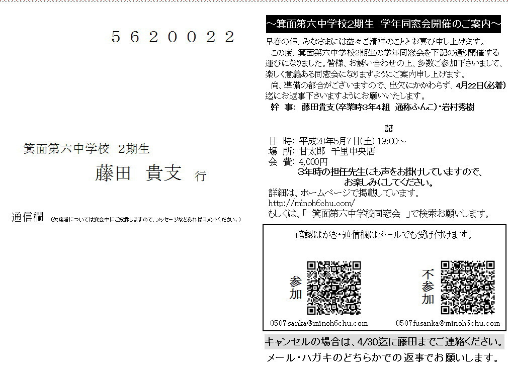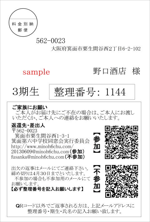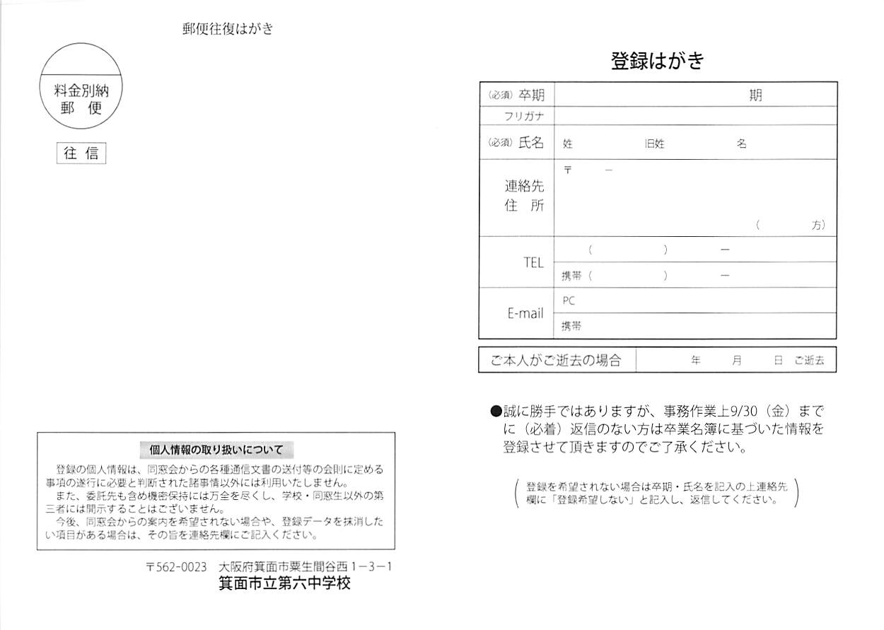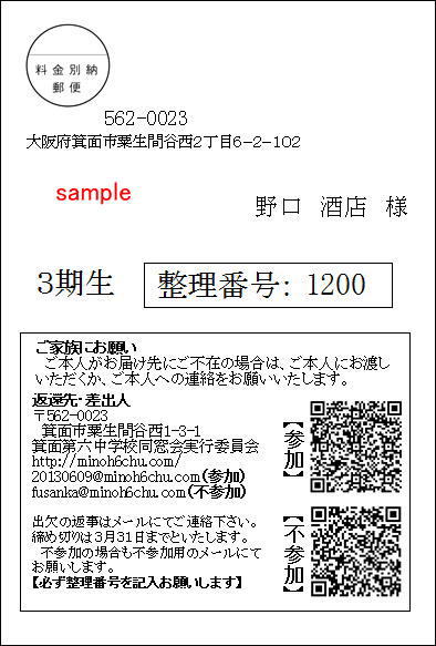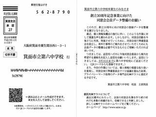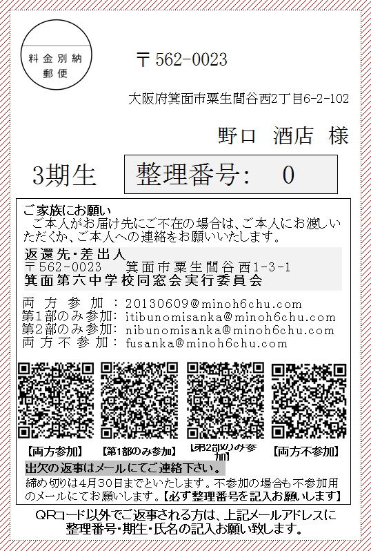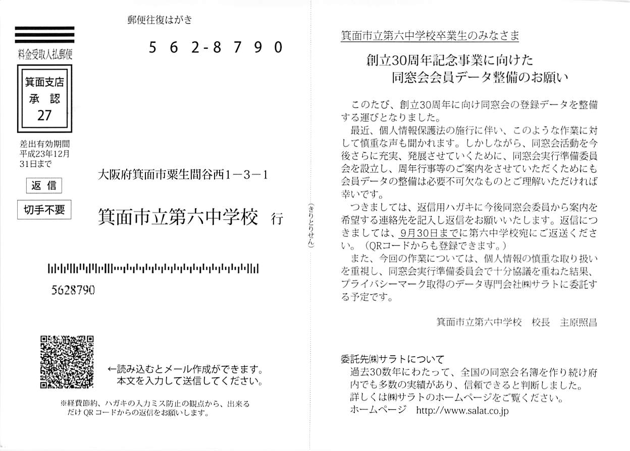 このメルマガは、「箕面市立第六中学校の同窓会の会員データ整備のハガキ」のQRコードで送信をしていただいている方約280名へお送りしています。